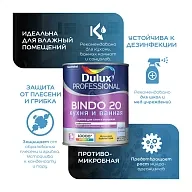 Краска для кухни и ванной латексная полуматовая Dulux Bindo 20 Professional предназначена для стен и потолка. Обладает нейтральным запахом. Купить полуматовую водно-дисперсионную краску Дюлакс Биндо 20 Профешнл по выгодной цене, для высококачественной отделки стен и потолков во влажных помещениях, таких как: кухни, ванные комнаты, санузлы, прачечные. Надежно защищает от плесени и грибка. Покрытие устойчиво к пару от бытовых приборов и конденсату. Наносится без брызг и потеков, легко разравнивается. В наличии Bindo 20 professional 2.5 л, 9л.