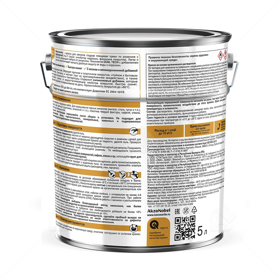 Благодаря технологии Dual Tech c добавлением воска, Hammerite обеспечивает двойную защиту металлической поверхности от воды и коррозии до 8 лет. Образует износостойкое и эластичное покрытие, которое остается устойчивым и не растрескивается при перепадах влажности и температуры внутри и снаружи помещений. hammerite обладает чешуйчатой структурой, служащей дополнительным барьером на пути кислорода и воды к металлической поверхности.
