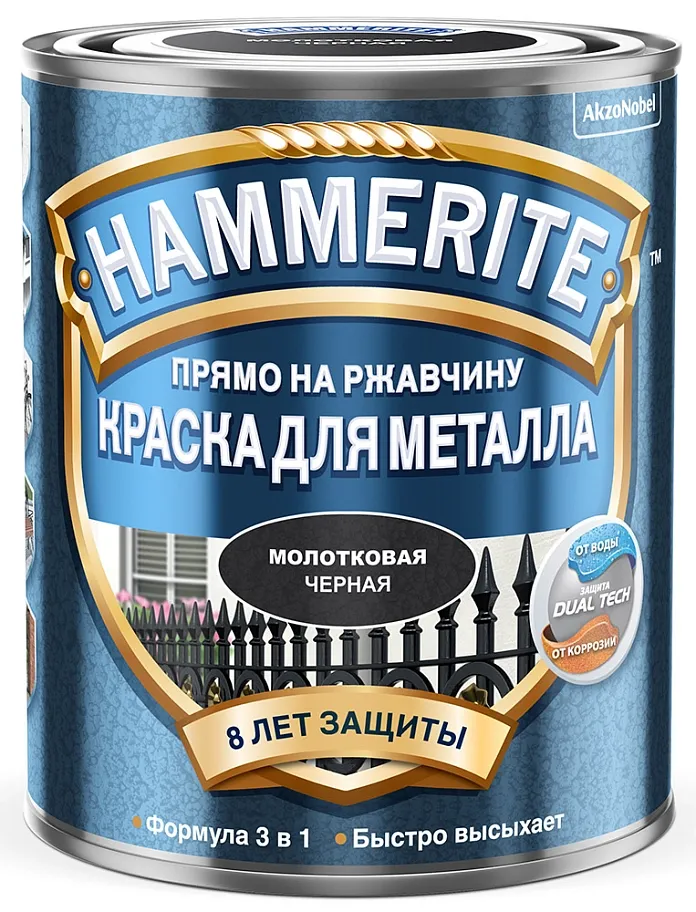 Купить краску по металлу Hammerite, алкидная молотковая краска Хаммерайт 3в1 для металлических поверхностей, идеально подходит для защиты металлических поверхностей от ржавчины. С формулой 3 в 1 (грунт, ингибитор коррозии, финишное покрытие), она легко и быстро придает красивый внешний вид и защищает металл. Благодаря технологии DUAL TECH с добавлением воска краска обеспечивает двойную защиту металлической поверхности от воды и коррозии.