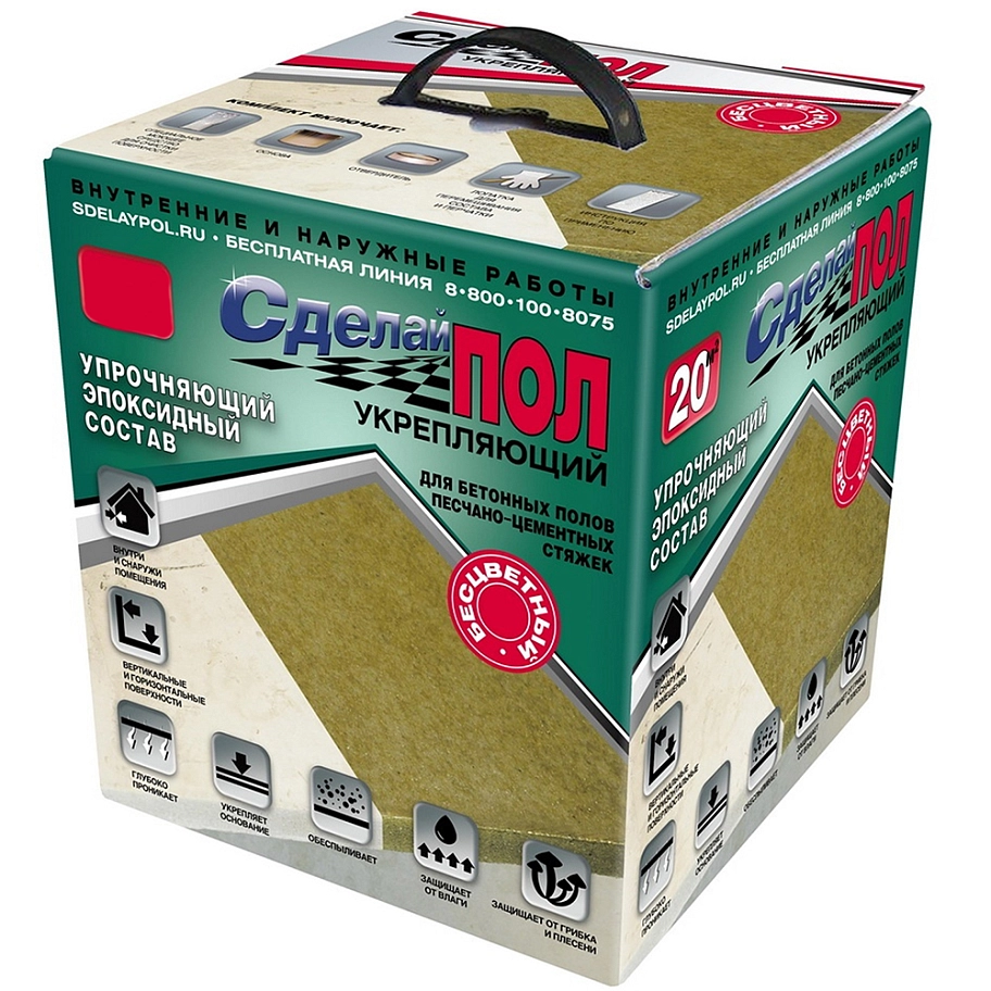 Сделай Пол «Укрепляющий» - двухкомпонентный эпоксидный состав глубокого проникновения, предназначен для упрочнения и обеспыливания бетонных полов, а также для защиты и консервации деревянных поверхностей от влаги.